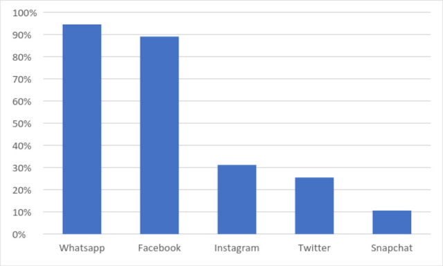 Usamos el celular para muchas cosas, lo cual es parte de su éxito en el mercado. Pero dentro del abanico de usos posibles, la conexión a las redes sociales es el motor clave de acceso al universo digital. El 71% de los encuestados usa redes sociales, una cifra que llega al 96% en el caso de los jóvenes. Las mujeres (77%) y aquellos con mayor poder adquisitivo (86%) usan las redes más que los hombres (65%) y los de menor poder adquisitivo (56%). La red más utilizada es WhatsApp, seguida de cerca por Facebook (ver gráfico 4). Instagram es para los jóvenes: la usan la mitad de los menores de 30, comparado con el 7% entre los mayores de 60. Twitter y Snapchat están muy lejos de la punta. WhatsApp y Facebook, a diferencia del resto de las redes son transversales a las clases sociales: entre los encuestados de menor nivel socioeconómico, el 96% usan WhatsApp y el 87% usan Facebook. Agustín trabaja en una fábrica en Arequito y cuenta que está online “muchas veces, a cada ratito”. Agrega: “cierro Facebook y entro a Instagram”. Tatiana, una bibliotecaria en una escuela pública, convierte su uso de redes en un verbo: “más que nada el celular lo uso para whatsappear”.