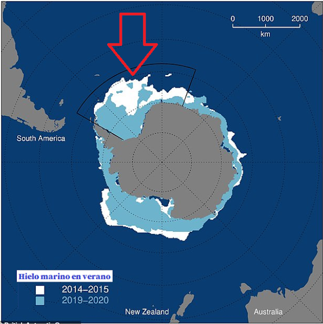 Mar de Wedell (señalado en rojo) y evolución de la masa de hielo flotante en épocas de verano (GRL)